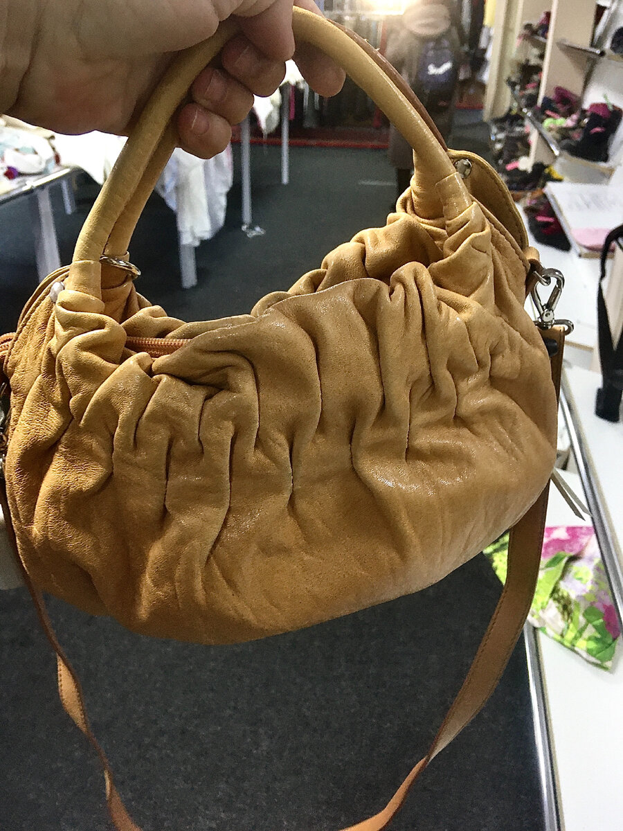 На новое поступление с утра не получилось прийти из-за загрузки на работе, годовой отчёт и всё такое, практически без выходных, без праздников, зато полно нервотрепки и усталости, забежала ненадолго в секонд лишь после обеда, вот всё, что смогла найти из сумок, надеюсь, в следующую субботу не пропущу новый завоз. Стараюсь продемонстрировать вам сумки из натуральной кожи. Небольшая мягонькая сумочка- мешочек новенькая, хорошенькая и цена приятная 500р, похоже на кожу, но могу и ошибиться. Не очень жалую сумки без плечевого ремня, но эта притягивает взгляд, необычная, роговые ручки, из натуральной кожи двух цветов:белой и под змею, добротная и качественная. Классная сумка из кусочков, с проглядывающей золотистой подкладкой, конечно, не практичная, но аккуратная и просто шикарная. 850р Кто любит клатчи? Я не очень, просто мне не куда носить такие сумочки, они очень женственные, не мой стиль, думаю, ручка-цепочка была бы не лишней, а с другой стороны, её не трудно приделать. Цена клатча