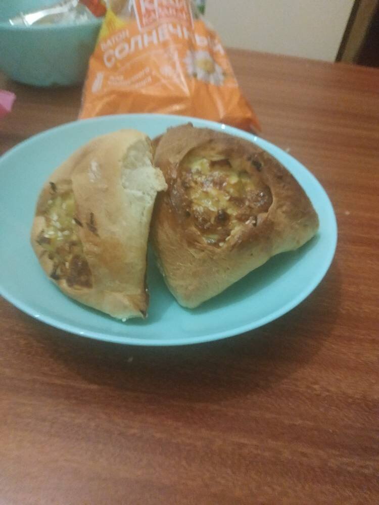 Ингредиенты: Молоко, Дрожжи, Масло сливочное , Соль , Сахар, Яйцо, Мука, Растительное масло, Курица, Картофель, Лук, Соль, перец, Желток + ст.л молока для смазывания, Кунжут для посыпки Способ приготовления: В тёплое молоко добавляем сахар, соль, яйцо, сливочное масло, дрожжи и перемешиваем. Затем частями добавляем муку, и замешиваем тесто. Чтобы тесто не липло к рукам добавляем растительное масло. Тесто убираем в тёплое место отдохнуть. Колбасу, картошку и лук нарезаем мелкими кубиками, добавим соль, перец и перемешаем. Тесто делим на 15 частей, и раскатываем лепешки. На каждый раскатанный круг выкладываем начинку. Лепим треугольники. Треугольники кладём на противень и смазываем взбитым желтком. Выпекаем в разогретой до 180° Духовке примерно 50-60 минут. Если сильно начнут поджариваться нужно прикрыть фольгой.