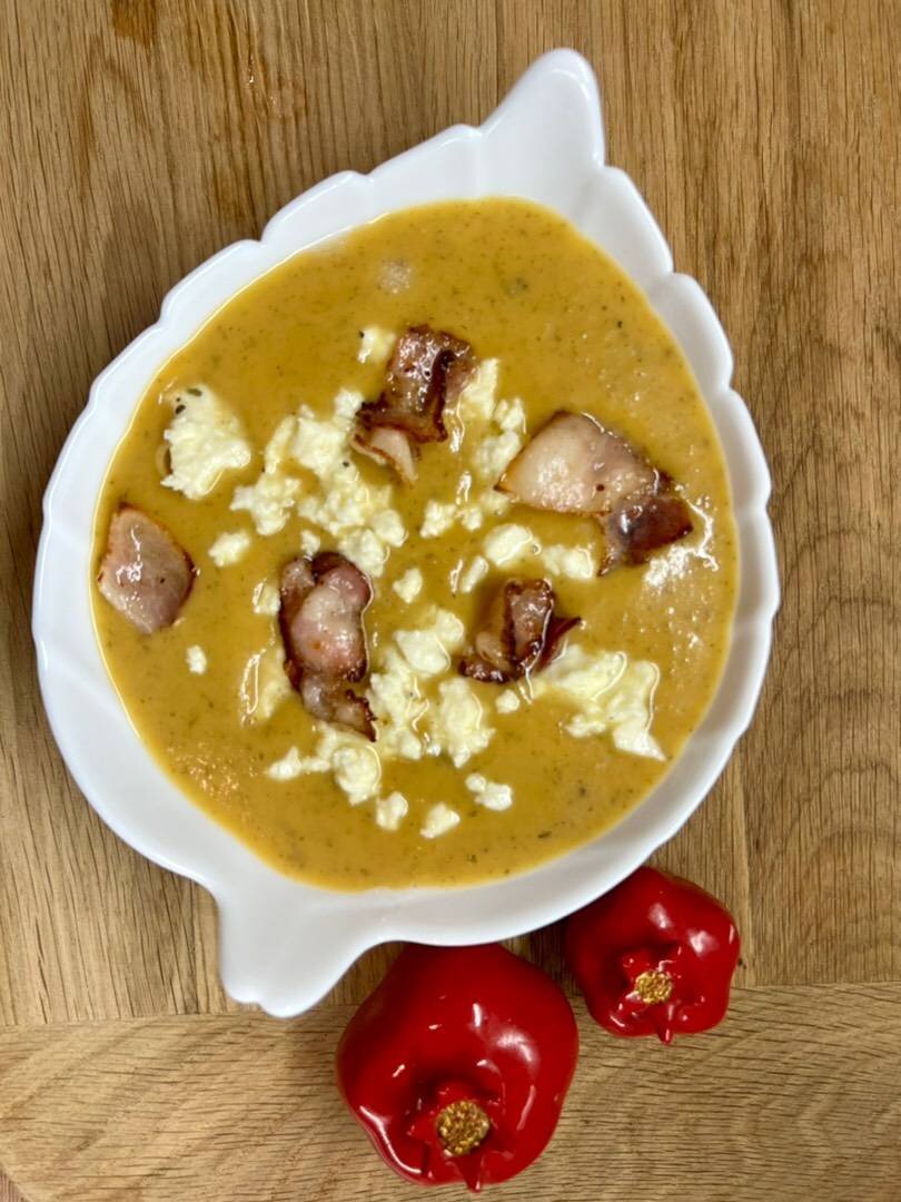 Ингредиенты: Батата, Картофель, Луковица, Шампиньонов (по желанию), Феты, Чеснока, Бекон, Соль, перец , Оливковое масло Способ приготовления: Луковицу и шампиньоны нарезаем произвольно и обжариваем на масле до готовности. В кастрюлю выкладываем очищенные и нарезанные (крупно) батат и картофель. Добавляем грибы и заливаем водой, чтоб слегка все Прикрывала. Солим по вкусу(но не забываем, что бекон и Фета соленые). Варим на медленном огне до готовности. Блендируем. Бекон режем и обжариваем на сковороде до золотистого цвета. Разливаем наш суп, сверху выкладываем бекон и крошим руками фету. Приятного аппетита!