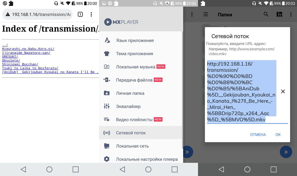 Теперь можно открыть смартфоном адрес своего сервера, скопировать ссылку на фильм и отрыть поток в плеере.
