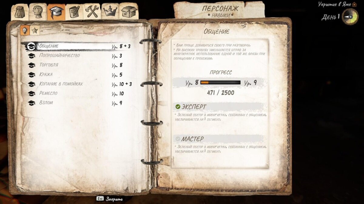 3. Практика прокачивается и при удачном применении навыка, и при неудачном. При этом есть разные степени неудачи. Например, с попрошайничеством: если прохожий прошёл мимо с каменным лицом, это неудача-неудача, плюс 2 очка навыка, а если прохожий поговорил с вами минуту, и только потом отказал, это просто неудача, плюс 5 очков навыка. Также навык прокачивается быстрее, если вы занимаетесь чем-то сложным. Тут игроку придётся принимать решения, высчитывать баланс. Непонятно, что выгоднее в плане прокачки: быстро вскрыть 10 лёгких замков, получив с каждого небольшой рост навыка, или провозиться всё это время с одним сложным замком, получив за него сразу много очков.