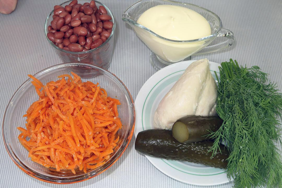 Сегодня мы будем готовить салат с фасолью и корейской морковью. Салат из красной фасоли с морковью по-корейски — это очень вкусный и, при этом, очень сытный салат. Он идеально подходит практически для любого стола – неважно, праздничный это стол или повседневный. Приготовить такой салат из фасоли с морковью по-корейски очень просто, и готовится он очень быстро. Морковь придает ему ярких красок, а фасоль и филе индейки — сытость. Для приготовления салата с фасолью и корейской морковью, нам понадобятся следующие ИНГРЕДИЕНТЫ: САЛАТ С ФАСОЛЬЮ И КОРЕЙСКОЙ МОРКОВЬЮ ПРИГОТОВЛЕНИЕ: Видео приготовления: РЕЦЕПТ ПРИГОТОВЛЕНИЯ: Филе индейки нарезаем небольшими кусочками. Маринованные огурцы нарезаем на кружки, а затем соломкой. Зелень укропа моем, сушим от лишней влаги и мелко рубим. В глубокой чашке соединяем все ингредиенты: филе индейки, маринованные огурцы, морковь по-корейски, фасоль (предварительно слив жидкость), укроп. Добавляем майонез и перемешиваем. Перекладываем готовый салат в красиву