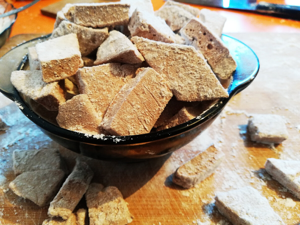 Вот никогда не думала, что придет время и я полюблю это нежное зефирное лакомство. Но с одной оговоркой, только то, что готовлю сама. Готовить легко, одно удовольствие. А главное знаешь, что нет красителей и каких-то вредных соединений. Сейчас я имею ввиду те, кто продлевает сроки годности, избавляют от лишней влаги и прочие нужности в производстве. А ваши дети любят маршмелоу? Как-то зашла в одним из маркетов и цена на данную сладость что-то уж очень высока. Приготовить проще, да и относительно полезнее. Для шоколадного маршмелоу мне потребовалось: 20 грамм желатина 120мл воды 440грамм сахара 120мл воды 4ч.л. какао 2ст.л кукурузного или картофельного крахмала 2ст.л. сахарной пудры Приготовить: Для приготовление маршлелоу заливаю двадцать грамм желатина сто двадцатью миллилитрами холодной воды. У меня обычный самый простой желатин по стоимости 26,00 рублей за пачку. Даю ему полностью набухнуть. Когда желатин впитает всю жидкость. Добавляю к нему какао. Какао много не бывает. Можно поло