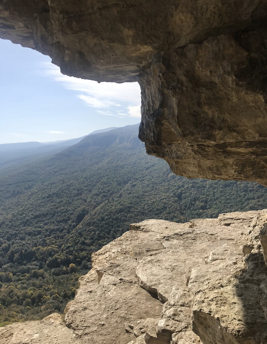 ОРЛИНАЯ ПОЛКА Кто-нибудь знает, какой этаж находится на высоте 300 м? Именно на такой точке обосновалась скала Орлиная полка, что в Мезмае. Каждый год мы планировали взять на абордаж это чудо природы, но не получалось. А в этом году все срослось: тёплый солнечный октябрьский денёк, возможности и желание. Наше маленькое путешествие можно условно разделить на этапы. Этап 1, самый короткий, стартует под девизом «ЭТО БУДЕТ КРУТО!», проходит в мечтах, планировании маршрута и поездке от Армавира до Мезмая. Этап 2. «ДЫШИТЕ ГЛУБЖЕ, ЭТО ГОРЫ!» начинается с парковки на обочине дороги. Мы приезжаем довольно рано и, судя по количеству машин, туристов на маршруте находится немного. Значит опасной толкучки на полке не будет. Закрыв глаза, мы пробегаем мимо лотков с пирожками и попадаем в осенний шуршащий лес. Здесь заблудиться невозможно, шагай себе и шагай по наезженной колее. Некоторые наивные ленивцы хотят добраться до цели на полноприводном транспорте. Но лесная дорога-самая легкая часть пути.