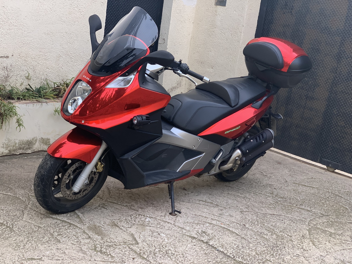 Эта Жилера у меня давно. С 2007 года. Есть у меня здоровенный туристический кемпер Гольфстрим Крещендо. Так-как штука это огромадная, сорок два фута, то к ней в придачу нужно было транспортное средство для локального перемещения по местности, причем чтобы оно висело сзади на бампере и его туда было сподручно в одинаре грузить. Мотик неудобно, у него сцепа. А тут вариатор, заезжает на рельс сам. Сперва я купил четырёхсотый Бурман. Только после выяснилось, что мне нужно на этом тендере раз в неделю ездить по маршруту Аликанте-Барселона и обратно. На эфир надо было летать в Москву. Кемпер зимовал в Аликанте, а зимой прямого самолёта тогда не было. Ну и в понедельник вечером я ехал в аэропорт Барселоны, а в четверг вечером возвращался из него. Расстояние там 530 километров в один конец и дорога быстрая. Вариаторная техника имеет одну особенность. Она нормально едет на скорости не выше 2/3 от максимальной. Сузук весит двести кило, а мощности у него 34 силы. И максималка в свете этого у него 145. 2/3 от 145-и это 96 километров в час. Если долго ехать быстрее, ремень вариатора перегревается и рушится, причём лавинообразно. Мало кому приходит в голову ставить датчик температуры ремня на мопедку, а вот на баговку, у которой тоже вариатор, ставят почти все. И по датчику это отлично заметно. И тогда я сменил Сузук на Ямаху Т-Макс. Но проблемы это не решило. Потому что у 500-ого Т-макса, к примеру, сорок сил на 220 кило весу, у 530-ого(я уже не помню точно какой у меня был) сорок пять. Арифметика наука точная и ежу понятно, что с сорока пятью силами и двумяста двадцатью килограммами снаряженой массы больше 165-и максималки хоть ты убейся не получится. А это опять же 110 безопасной для вариатора скорости. Ну край 120. Поток днем едет 130, а ночью 150. И по уму надо ехать со скоростью потока. Или даже чуть выше, если не хочешь чтобы тебя в конце-концов снесли невнимательные граждане обгоняя. То-есть нужно что-то вариаторное, но при этом с максималкой не меньше двухсот, а ещё лучше 220. Так-как вес у всех максискутеров больше двух сотен, то тут надо от семидесяти сил. А такой максик только Жилера восьмисотая. Или её более поздний рестайлинг- Априлия 850. По сути это совершенно одинаковые скутера, отличающиеся только передними фарами и немножко обтекателем.