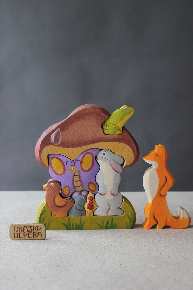По сюжету сказки муравей пережидает дождь под шляпкой гриба, но вскоре к нему просится промокшая насквозь бабочка. Муравей переживает, что под грибом не хватит места, но пускает её. От дождя хотят спрятаться также мышка и воробей, и, наконец, заяц, за которым гонится лиса. Животным приходится потесниться, но домик из гриба вмещает всех! Как так получилось, что гриб, под которым в начале ливня едва помещался один муравей, в итоге уместил и зайца? Это предстоит угадать Вашему малышу! Игрушка «Под грибом» от мастерской «Сказки дерева» – это объёмный пазл: для каждого персонажа нужно найти место под шляпкой гриба. Но в то же время эта игрушка, конечно, представляет собой нечто гораздо большее! Лиса, как мы знаем из сказки, не поместилась под грибом, и поэтому стоит отдельно, но и другие фигурки объёмны и устойчивы. Гриб, лягушка, заяц, бабоч