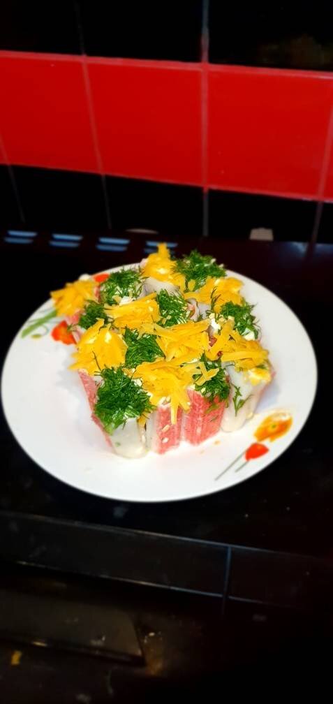 Ингредиенты: Крабовых палочек, Огурец, Варёных яйца, Майонез, Чеснок, Желток для украшения, Укроп для украшения Способ приготовления: Натираем на терке 2-3 вареных яйца, добавляем по вкусу выдавленный через пресс чеснок и смешиваем с майонезом. Огурец нарезаем тонкими полосками на длину крабовой палочки. Раскручиваем крабовую палочку, кладем начинку из яиц и полоску огурца, скручиваем в ролл. Края обмакиваем в тертый желток или укроп. Я выложила в шахматном порядке.