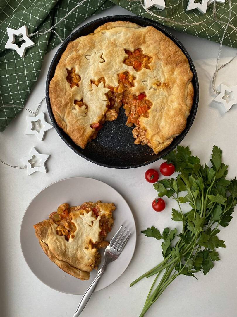 Шикарный пирог с овощами, мясом и сливочно-томатным соусом точно станет украшением вашего стола. Как по мне, так очень празднично и очень вкусно и оригинально. Ингредиенты: слоенного теста, фарша (у меня из индейки), морковь, средней луковицы, среднего болгарского перца, сельдерея, томатной пасты, сливки от 30%, соль, перец по вкусу, паприки, прованских трав (тимьян, розмарин), оливковое масло Способ приготовления: 1. Нарезаем лук, морковь, болгарский перец и сельдерей на небольшие кубики. 2. На среднем огне обжариваем немного лук, затем добавляем все овощи и тушим минут 5. 3. К овощам добавляем фарш, перемешиваем и обжариваем до готовности. 4. Добавляем соль, перец, паприку и перемешиваем. 5. Как только мясо готово, добавляем томатную пасту и тушим пару минут, затем вливаем сливки, прованские травы и тушим до загустения соуса (буквально 2-3 минуты). Снимаем с огня. 6. Один пласт теста раскатываем по диаметру своей формы и выкладываем дно (я ничем не смазывала форму). 7. Выкладываем на