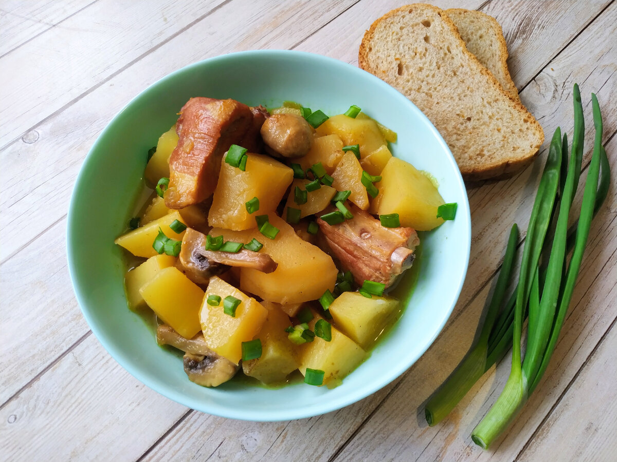 Сегодня предлагаю вам рецепт по-домашнему простого горячего блюда из картофеля, грибов и мяса (у меня ребрышки). Такой вариант подойдет для семейного обеда или ужина. Все готовится без особых усилий, без возни и затрат времени на приготовление, от хозяйки потребуется только все закинуть в сковороду и поставить на огонь) Простое, но вкусное блюдо из самых обычных продуктов.