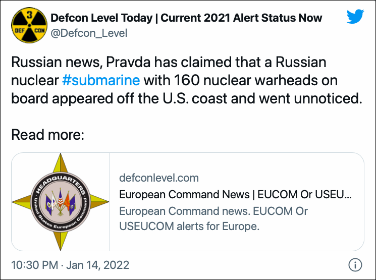 А началось всё вот с этого твита: Русские новости, "Правда" заявила, что российская атомная подводная лодка со 160 ядерными боеголовками на борту появилась у берегов США и ушла незамеченной. Что за Defcon такой? Как они о себе пишут - Defcon Level Warning System — это организация и сообщество США, занимающееся сбором разведывательных данных, чтобы информировать общественность о текущих мировых событиях, угрозах и попытка как можно точнее оценить эти события и уровни угроз. Что ж, последуем совету Read more - почитаем по теме больше. Заходим на сайт, вот что там находим, я сразу перевод приведу дословно: «Правда» сообщила, что российская АПЛ проекта «Борей» имеет 16 баллистических ракет «Булава», каждая из которых способна нести до 10 ядерных боеголовок. «Правда» утверждала, что атомная подводная лодка незаметно подошла к побережью США, прежде чем вернуться на свою базу, и что российские атомные подводные лодки смогут «постоянно патрулировать воды у побережья США в случае, если Росси