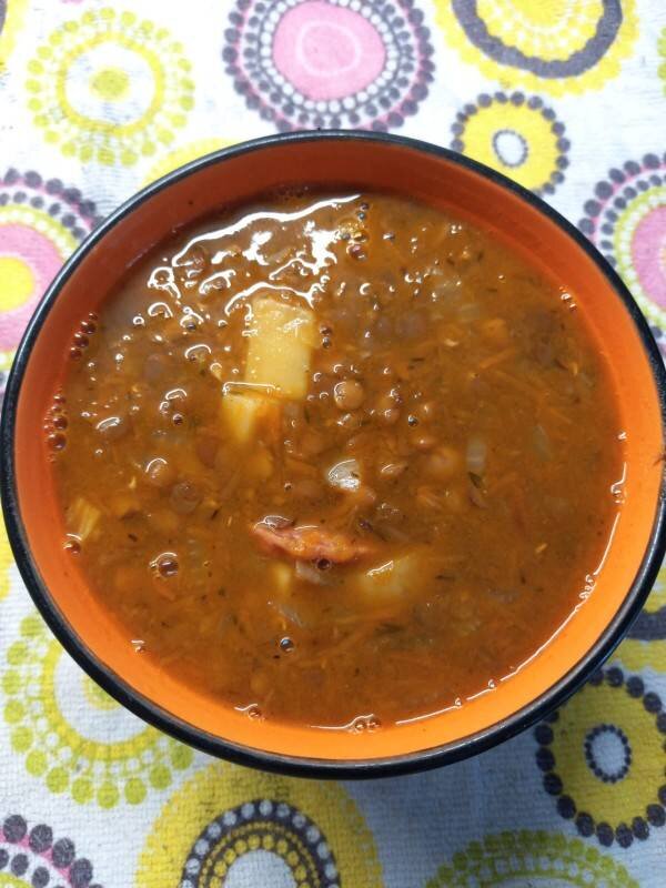#быстро Ингредиенты: воды, чечевицы, картофеля, репчатый лук, растительное масло , морковь, чеснока, томатной пасты, копченостей, смесь перцев, тимьян, зелень, соль Способ приготовления: В кастрюле на растительном масле обжарить нарезанный кубиками лук и натертую на мелкой терке морковь. Добавить раздавленный чеснок и томатную пасту. Отправить нарезанный на мелкие кубики картофель и промытую чечевицу, залить холодной водой, довести до кипения, добавить смесь перцев, тимьян, варить минут 15-20 до готовности. За 5 минут до готовности добавить обжаренные отдельно копчености. Приятного аппетита. Если Вам понравился рецепт: буду рада увидеть Ваши фотоотзывы и комментарии.