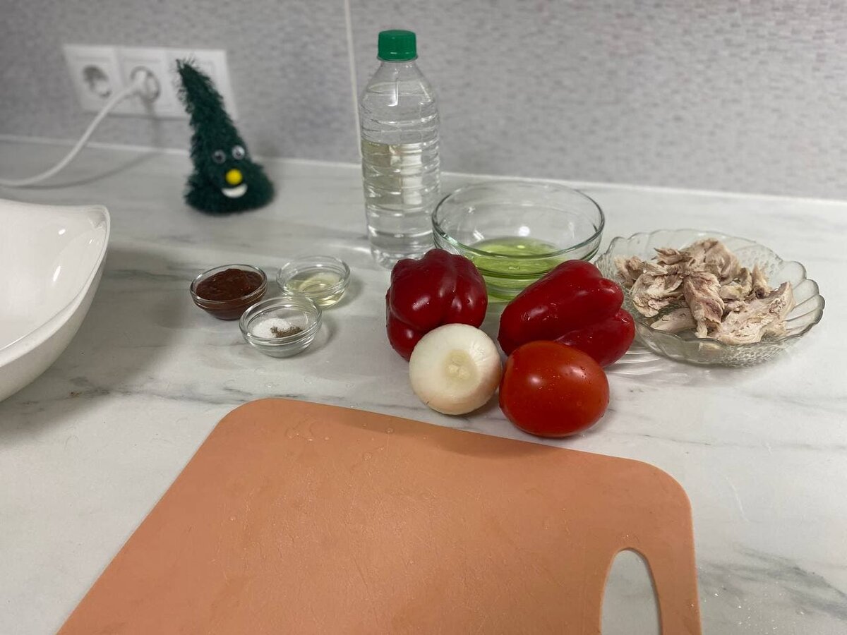 На самом деле этот салат продается в бэхетле, но там он не вкусный. Ингредиенты все то же самое, но заправка от меня. Ингредиенты: 1. Куриная грудка отворная - 250 г 2. Болгарский красный перец - 2 шт 3. Помидоры - 1 шт 4. Лук - 1 шт 5. Для заправки нужно: Рецепт: 1. Подготавливаем наш стол. 2. В миску с оливковым маслом добавляем аджику, соль, перец, паприку, уксус и сахар. 3. Нарезаем соломкой болгарский перец. 4. Разделяем курицу на волокна. 5. Нарезаем лук полукольцами. 6. Режем квадратиками помидор. 7. Выкладываем все в нашу салатницу. 8. Заливаем все нашей заправкой, перемешиваем, посыпаем нашей зелень. Салат готов. Всем приятного аппетита. Хорошей, продуктивной недели.