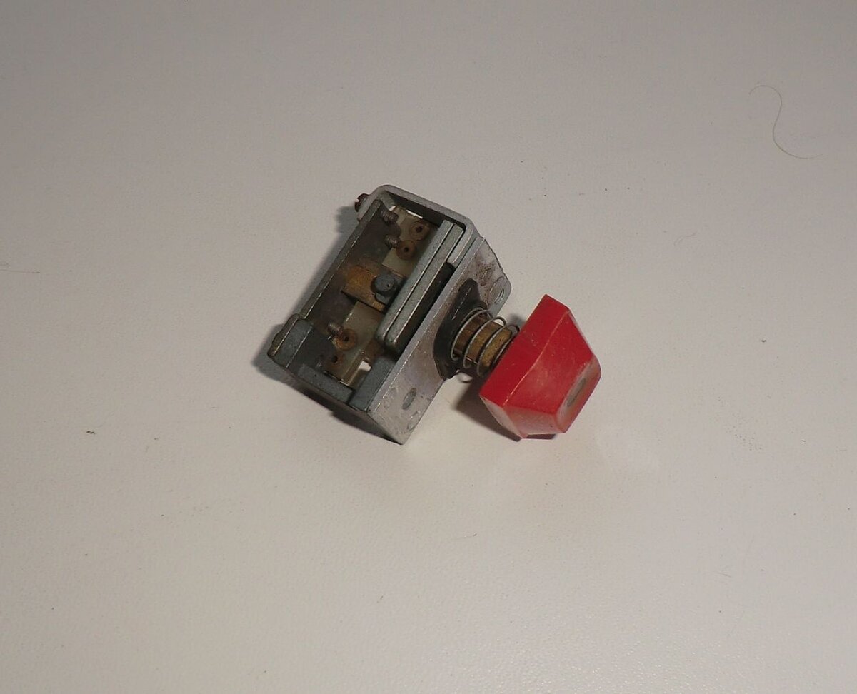 Однажды мне довелось раздобыть кусок клавиатуры от какой-то панели управления, вероятно бывшей в прошлом пультом промышленной установки. А может и узла телефонной связи, кот его знает. В общем, пока рабочие ждали мусоровоз, что бы погрузить и вывести всякое разное, я кинул глаз на кучу электронного хлама, и самое интересное отправил в багажник своей машины. Мне интересно поколупать старые железки, рабочим оставалось меньше грузить, все остались довольны. Так вот, среди разного барахла оказалась часть клавиатуры, которая мне показалась очень любопытной, из-за принципа работы кнопок. Вот одна из кнопок той клавиатуры, и её смело можно назвать вечной, при одном важном условии. Кнопка рассчитана на небольшой ток, поэтому если подкинуть к ней мощный электромотор, то контакты засветятся яркой вспышкой и просто сгорят. Главная особенность этой вечной кнопки, её секрет – геркон, который и замыкает цепь. Геркон сделан в виде контакта в герметичном стеклянном корпусе. Корпус заполнен инертным га