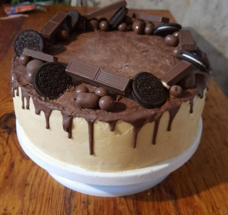 Ингредиенты: Бисквит, Яйцо , Сахар , Мука , Разрыхлитель , Молоко , Масло , Прослойка (банан - карамель), Банан , Масло сливочное , Сахар , Молоко , Масло сливочное , Желатин , Вода , Крем, Йогурт питьевой , Сахарная пудра , Желатин , Вода , Ганаш, Шоколад , Масло сливочное, Украшение, Орео , Орешки в шоколаде , Конфеты круглые большие , Шоколад , Шоколад Киндер Способ приготовления: Приготовление бисквита: Яйца взбиваем с сахаром до бела (5 минут) добавляем муку с разрыхлителем в два этапа, молоко с маслом доводим до температуры 60-85 градусов, и вводим в яичную смесь, наливаем в форму (28 см) и ставим в разогретую духовку до 170 градусов - 30-40 минут. Приготовление прослойки: сделаем карамель, сахар растапливаем на медленном огне, добавляем молоко кипяченое, масло сливочное, остужаем. Растапливаем сливочное масло, кидаем туда бананы, и варим до кашообразной массы. Смешиваем карамель с бананом и добавляем туда растопленный желатин. Приготовление крем: В йогурт добавляем сахарную пудр