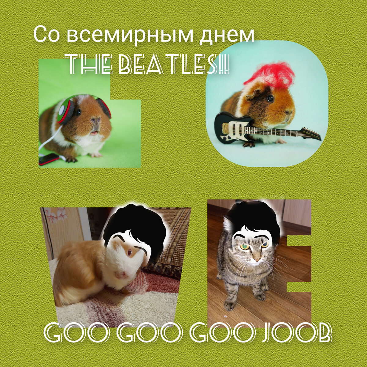 Всем здравствуйте! Hello! Сегодня,уже ровно 21 год по решению ЮНЕСКО в этот день,16 января, во всем мире празднуют День Битлз (World Beatles Day)! Я являюсь поклонницей этого легендарного ливерпульского квартета, а вместе со мной и мои питомцы)), ведь им приходится слушать ту музыку,какую выберет хозяйка))). Поэтому принимайте поздравления от нас всех, в виде вот таких коллажей-открыток: Почему именно 16 января? Потому что в этот день в далёком 1957 году в Ливерпуле открылся клуб The Cavern, где впервые начали выступать тогда ещё совсем юные и никому неизвестные Пол Маккартни, Джон Леннон, Джордж Харрисон,а затем к ним присоединился и Ринго Старр. У любого меломана и поклонника группы есть свой список песен,которые он выделяет для себя как самые лучшие и близкие сердцу. В наших с питомцами коллажах зашифрована одна из поздних и многим кажущейся странных песен Битлз (какая, пишите в комментариях). Не назову её самой любимой,но как-то она меня зацепила и я её часто вспоминаю и слушаю