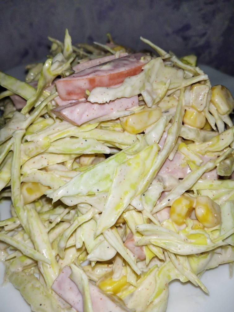 #канікули Ингредиенты: середня капустина, цибулина , кукурудзи, Дитячого майонезу або домашній майонез, Сіль, перець, солодка паприка, вареної ковбаси гарної якості Способ приготовления: Порізати капусту дрібно, трохи потовкти, ковбасу соломкою, вкинути кукурудзу і цибулю нарізану соломкою. Додати сіль і перець за смаком, посипати солодкою паприкою. Заправити майонезом і гарно вимішати. Смакота.