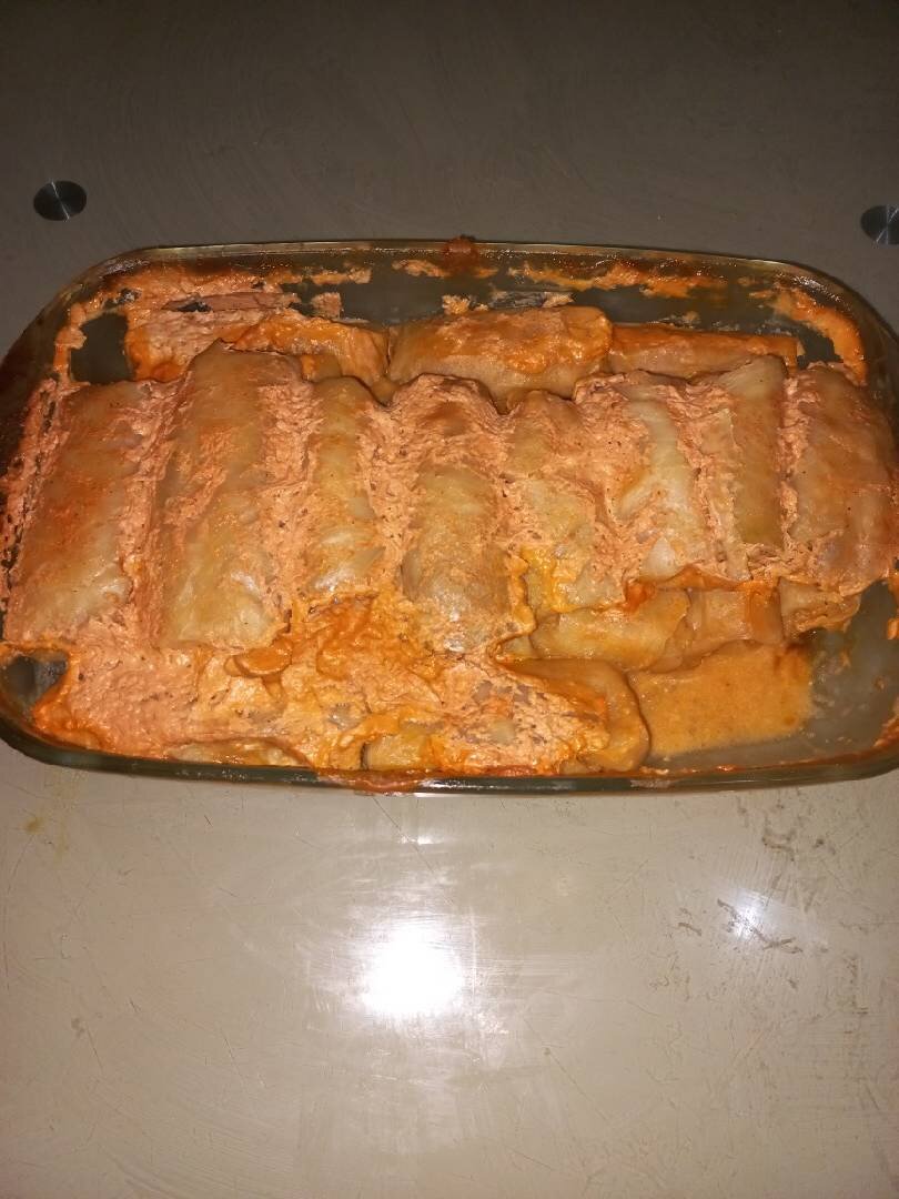 Доброго вечора цей рецепт я пропоную для любителів смачно по-поїсти Ингредиенты: Капуста, Рис, цибуля, сметани, Кечуп по смаку, Заливка для голубців, Сметана, Кечуп, Перець Способ приготовления: Взяти капустину положити в мікровалновку на 6 -12хв а потім взяти положити в холодну воду і вона помякшає Зварити рис Піджарити цибулю Добавити до вареного рису Посолити поперчити Крутимо голубці Складаемо в бритванку Заливаемо заливкою з смитанно кечупнеаою заливкою Ставимо в духовку на 1 год 60 сек Приемного апетиту
