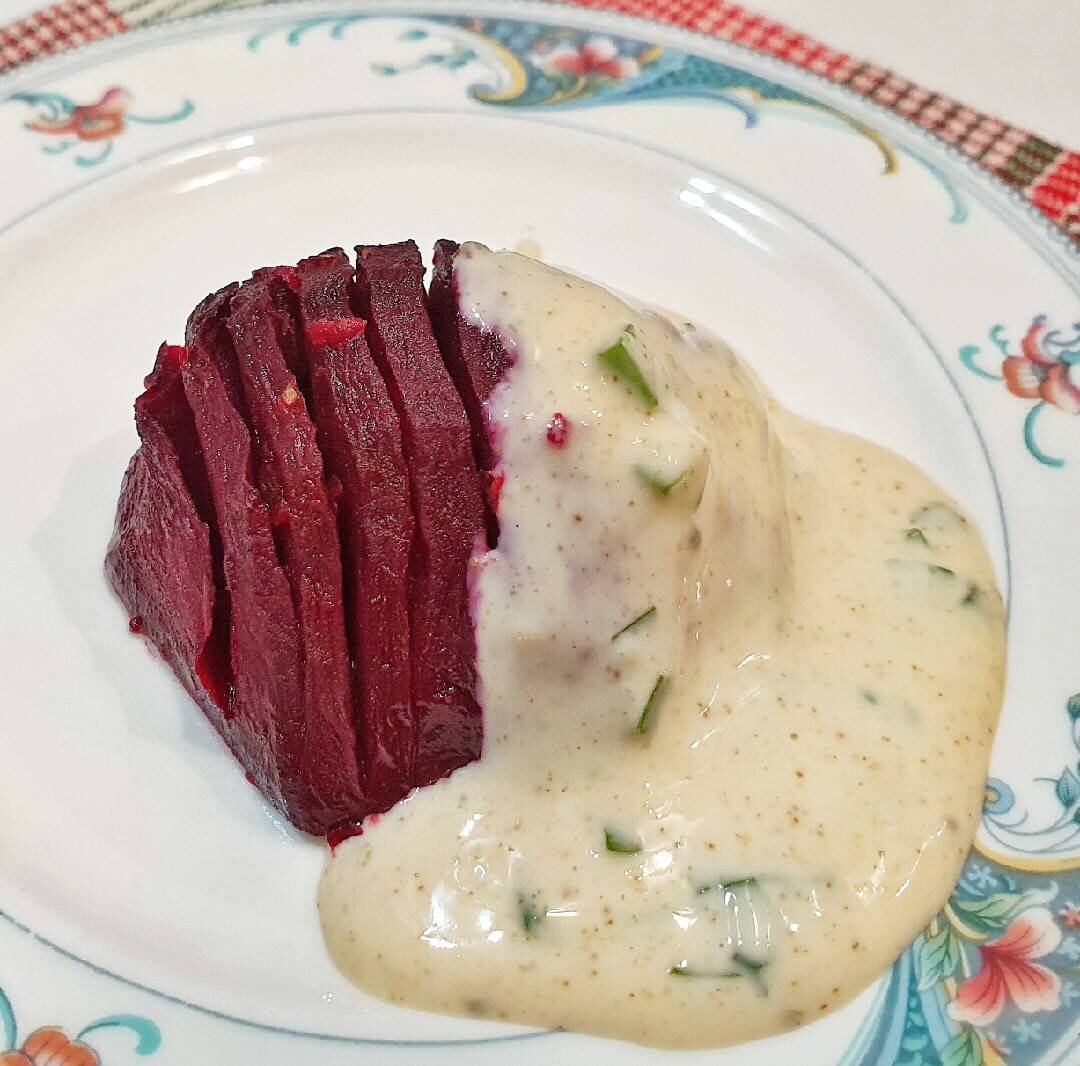 Очень вкусное и полезное блюдо. Можно есть и как гарнир, и как закуску. Я вначале с опаской отнеслась к этому рецепту, т.к. не люблю, когда свекла несоленая. Но сочетание свеклы и лимона оказалось восхитительным. А соус дополнил превосходный вкус свеклы. Кстати, соус "Ранч" американского происхождения. Там продаются наборы сухих приправ для этого соуса. Хозяйкам остаётся только смешать жидкие ингредиенты с приправами. На фото блюдо из половины ингредиентов. #свекла #соусранч Ингредиенты: свеклы весом по 120-150 г, ст л растительного масла, лимона - сок и цедра, соли, орегано, воды, Соус Ранч, майонеза, пахты/сметаны/йогурта, ч л сухого чеснока, ч л нарезанного зелёного лука, ч л нарезанной петрушки или 1 ч л сушёной, ч л сладкой паприки, ч л лимонного сока, черного перца, орегано, соли Способ приготовления: 🔰Сырую свеклу очистить от кожицы и разрезать пополам. 🔰Вдоль свеклы положить две деревянные шпажки и нарезать на тонкие ломтики, не прорезая до конца (для этого и нужны шпажки). ?