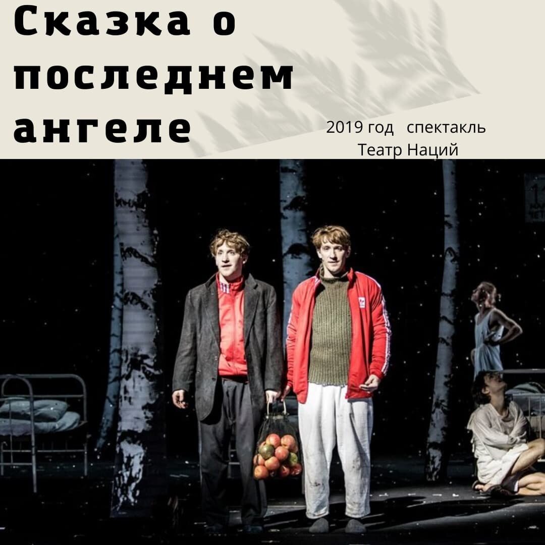 "Сказка о последнем ангеле" 2019 год Режиссёр : Андрей Могучий «Сказка про последнего ангела» стала лауреатом премии «Золотая маска» в номинации «Драма / спектакль большой формы» сезона 2019-2020. Кроме этого постановка была выдвинута на премию «Золотая маска» в номинациях: – работа режиссера (Андрей Могучий) – работа художника (Мария Трегубова) – мужская роль (Глеб Пускепалис) Роман Михайлов, чей текст "Героин приносили по пятницам" составляет основу драматургической композиции "Сказки про последнего ангела" (сценарий Светланы Щагиной). Андрей Самойленко - 25-летний пациент психушки, лежит в наркологическом отделении, хотя не наркоман, и наблюдает, как в больницу доставляют регулярно по пятницам наркотики Вместе с соседом по палате, добродушным, хотя и не шибко сообразительным толстяком Игнатом, он после того, как зловещий Черный пытается вколоть ему дозу героина, совершает побег, направляясь в Минск к выписавшемуся ранее Леусю, а с ним втроем далее в Москву, где живет школ