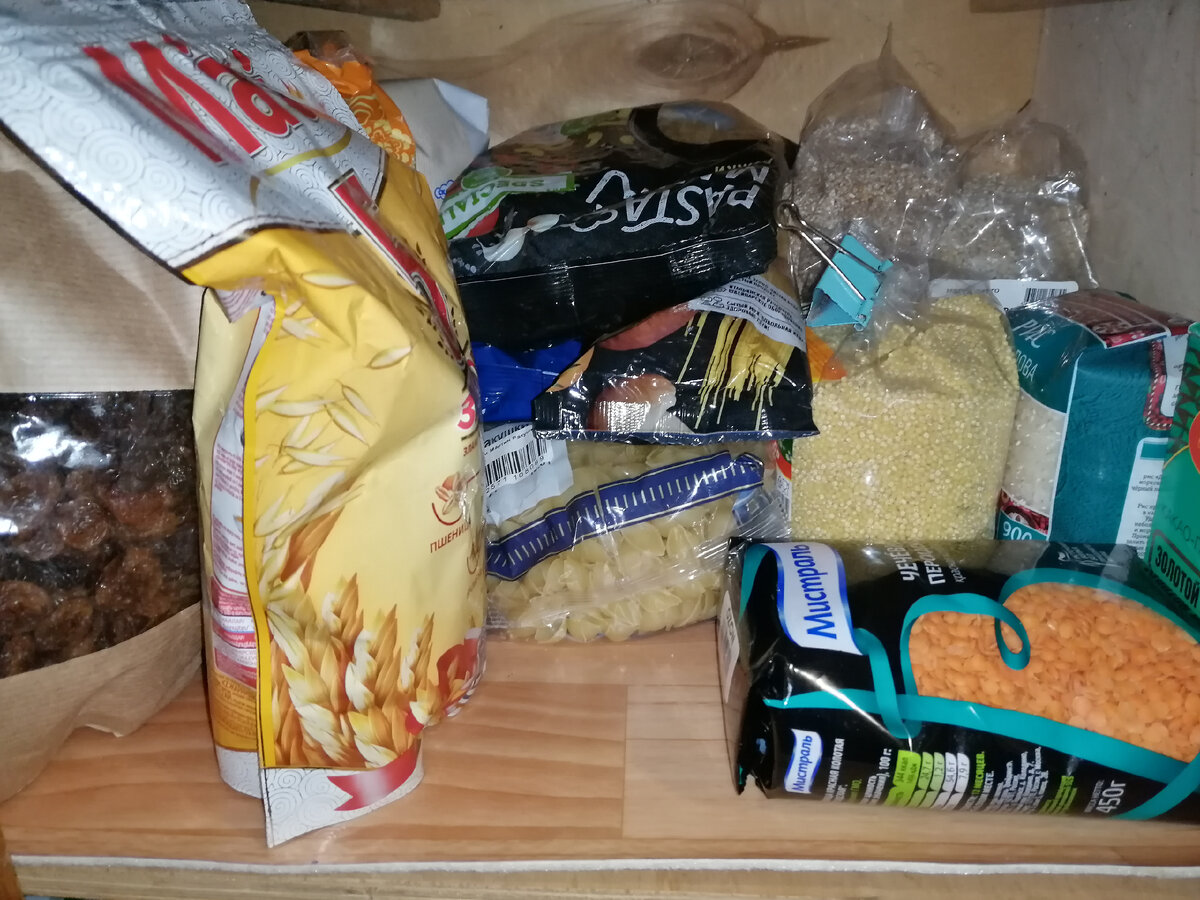 Всем добрый день! Объявила я о начале двух недель без походов в магазин и только потом полезла запасы смотреть. Надо бы наоборот, конечно)). Ибо картина нарисовалась не очень радужная. Так то нам на две недели всего хватит, но придется и постараться, дабы не сидеть ни на картошке с соленьями, ни на макаронах с зажаркой (вкусно, кстати, вот прям удивительно, как вкусно 😁). Первое, куда я заглянула, это был кухонный шкаф с крупами и макаронами. Ну да, не густо, но и не пусто. Макароны - вот их много, в сумме больше двух кило. По половине пачки пшена и риса, гречки - полторы упаковки, по полной упаковке перловки, пшеничной и кукурузной крупы. Маленькая упаковка чечевицы, пачка хлопьев для каши. Почти килограмм изюма. Вот гороха нет, это печально. Какао зато есть, не знаю, правда, чем он мне поможет)). В кои то веки у нас нет круп в пакетиках, давно не покупали, всё закончилось. Ну и покупали мы их часто в Светофоре, а там сейчас круп почему-то нет (точнее, не было неделю назад, может и