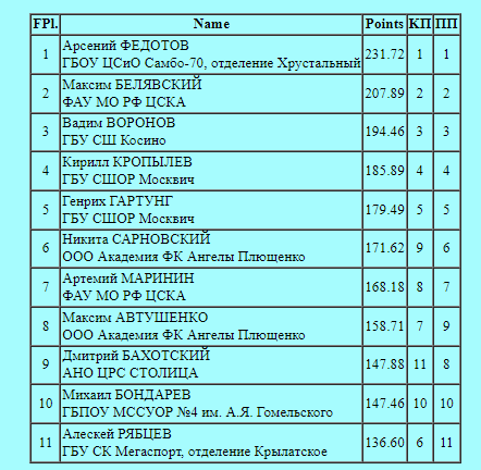 Арсений Федотов впервые в карьере принял участие в турнире "Кубок Москвы" и сразу же завоевал золотую медаль. О выступлении юниоров в короткой программе можно почитать отдельно здесь: Арсений Федотов (Тутберидзе) лидирует на Кубке Москвы22. Белявский (ЦСКА)-2, Сарновский и Автушенко (Плющенко) выступили плохо. Заявивший сложнейший на этом турнире прыжковый контент, и самый сильный участник этого турнира - Максим Белявский, с прокатом произвольной программы не справился. Четырнадцатилетний фигурист попытался исполнить программу с тремя четверными прыжками и двумя трикселями. Первый четверной в программе - тулуп, получился лишь в 2,5 оборота (засчитан как тройной тулуп с понижением до двойного). Далее Максим собрался, и смог чисто исполнить четверной сальхов, тройной аксель и тройной флип (судьи отметили неясное ребро). Во второй половине программы, по задумке тренера Максим судя по всему должен был исполнить три каскада: 3Л+ойлер+3С, 4С+ ? и каскад 3А+3Т. С каскадами с акселем и лутце