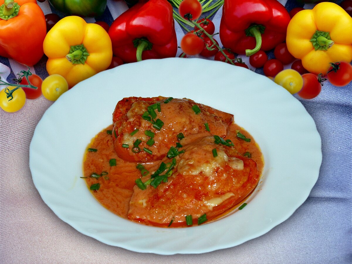 Задумала как-то сделать перчики по-французски в духовке. Это когда фаршируются не целые перцы, а половинки. Уже и соус придумала, какой будет. А мясного фарша дома не оказалось. В холодильнике была только упаковка деревенских котлет «Троекурово». Вот таких: Ну, что же теперь перцы не готовить? Вместо фарша решила использовать полуфабрикат котлет. Как потом оказалось не зря. Перцы получились на славу – сочные, мягкие, красивые. Во вкусе «подмена» не заметна. Поэтому, если вдруг у вас нет в наличии фарша, то возьмите любые сырые котлеты. Единственное, учитывайте, что в полуфабрикат уже добавлена соль. Поэтому её нужно добавлять по минимуму. Теперь самое главное – рецепт! Описываю, как я готовила, но можно менять ингредиенты и количество перцев, а также взять обычный мясной фарш. Перец в соусе по-французски Продукты 5 средних сладких перцев (650 г) Начинка: 400 г деревенских котлет «Троекурово» 80 г пропаренного риса (1/2 мст) 1/2 моркови 1/2 луковицы 1/2 ч. л. приправы для курицы (с соль
