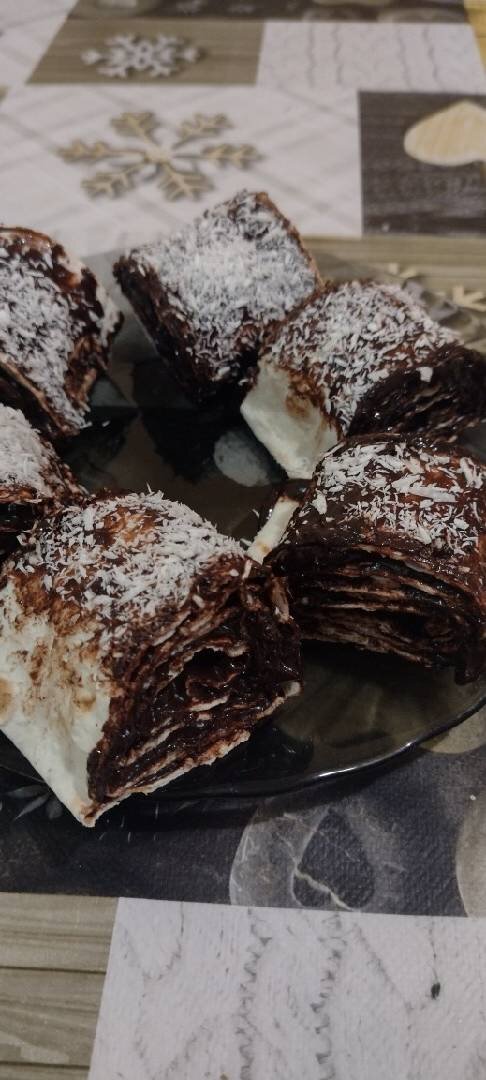 Ингредиенты: какао, сахара, молока, сливочного масла, Ваниль, лаваша, Кокосовая стружка Способ приготовления: Какао соединить с сахаром молоком ванилью и растопленным сливочным маслом хорошо перемешать и уварить около 5мин полученный крем остудить, вкус получится как у черного шоколада Крем распределить на листы лаваша равномерно свернуть рулетом остатки крема намазать сверху посыпать кокосовой стружки порезать на произвольные кусочки