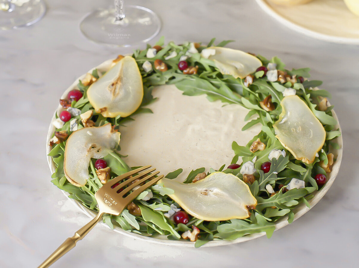 Как насчет того, чтобы разнообразить новогодний стол и приготовить наивкуснейший салат, который составит конкуренцию оливье? Есть идея! Как вы относитесь к рукколе? Мы как раз знаем рецепт одного простого и интересного салата, на приготовление которого уйдет не более 10-15 минут. Друзья, приготовьтесь насладиться сочетанием ароматной груши, свежей рукколы и пикантного сыра дорблю. Будет невероятно вкусно! Ингредиенты: Для заправки: Приготовление: 1. Рукколу хорошо промыть и просушить бумажным полотенцем. 2. Грушу нарезать вдоль слайсами. Для карамелизации разогреть мёд на среднем огне и обжарить ломтики груши с двух сторон до золотистого цвета. 3. Орехи нарезать крупными кусочками или просто немного раздавить в ступке. Далее быстро обжарить их в том же мёде, где карамелизировалась груша (обжаривать на среднем огне). 4. На большую плоскую тарелку выложить рукколу в форме рождественского венка, оставив центр пустым, следом – грушу. Раскрошить сыр дорблю и произвольно разложить