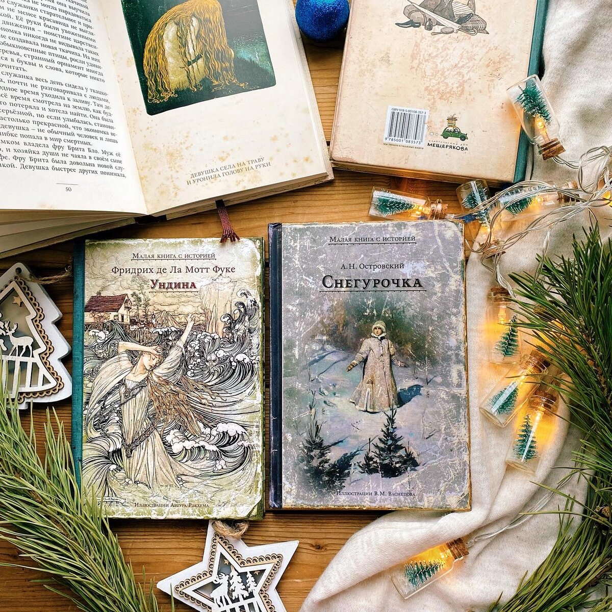 Если вы в поиске хорошей подарочной серии книг классической литературы, обязательно присмотритесь к серии "Малая книга с историей" от Издательского дома Мещерякова. Ее особенность: ✔️ уникальное, изысканное оформление под старые книги ✔️ мелованная плотная бумага ✔️ цветные иллюстрации ✔️ тщательность в выборе перевода и иллюстраций В серии выходят лучшие произведения русской и зарубежной литературы. А от состаренных желтоватых листов книг создаётся ощущение уютности. Как будто книгу перечитывали множество раз и ты стал причастным к некоему таинству чтения ✨ Моя небольшая коллекция пополнилась двумя новыми томиками: 📖 Ундина - Фридриха де Ла Мотт Фуке Повесть о влюблённой русалке, которой пришлось пережить несколько переводов. Первый перевод в XX в блестящего писателя и поэта Василия Андреевича Жуковского отодвинул фигуру автора на второй план. У него получилась «романтическая сказка» в стихах. Прозаический же перевод повести, который используется в этом издании, был сделан уж