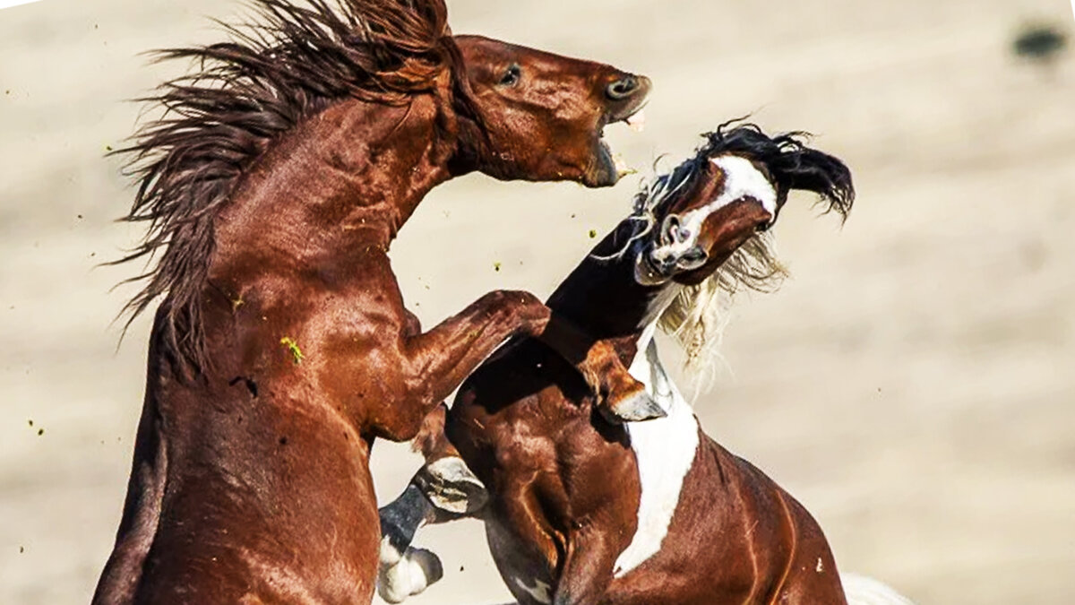 Недавно я посмотрел один увлекательный фильм. В нем рассказывалось о диких лошадях Южной и Северной Америки – мустангах. Удивил тот факт, что лошади могут быть совсем не такими, какими мы их знаем: добрыми, ласковыми, мирно щиплющими траву в леваде или осторожно берущими мягкими губами кусочек хлеба из детской ладони. С мустангами дело обстоит совсем иначе. Узнав о мустангах из фильма, я очень заинтересовался и решил исследовать их особенности и образ жизни дальше. И вот что получается: в дикой природе любая особь становится агрессивной, способной отвоевывать себе "место под солнцем" в условиях естественного отбора. Поэтому и одичавшие лошади также агрессивны и свободолюбивы. В некоторых ситуациях мустанги ведут себя, как настоящие хищники. Удар копыта такой лошади весит около 600 кг, а если она схватит зубами, то может переломить конечность, перекусить или оторвать сухожилия и мышцы, откусить ухо, придавить своим весом. Мелких хищников мустанг способен лишить жизни. Однако эти лошади