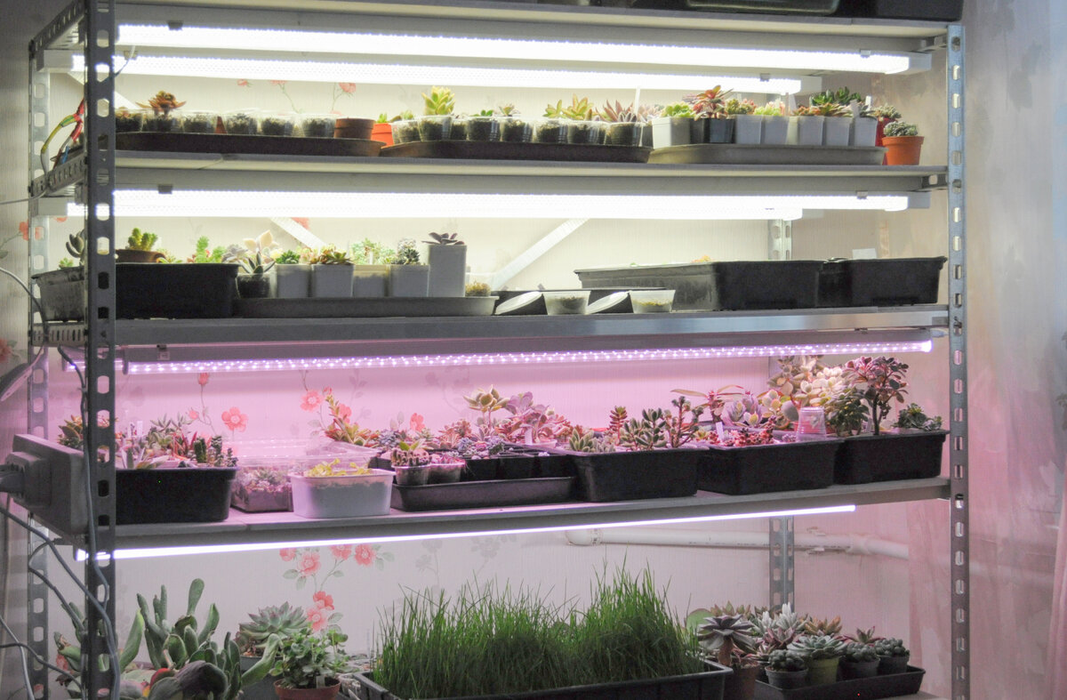 2. Полки размер 120х50 см, по две лампы 35Вт, расстояние до растений 15-20 см. Хорошо для разных каланхоэ, крассул, гриновий. Растут компактно, окрашиваются, некоторые крассулы даже решили зацвести.