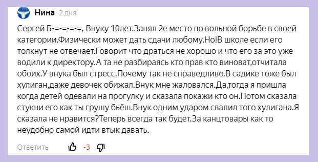 Нешуточный спор разгорелся на днях в комментариях. На тему - можно ли давать сдачи хулигану, если тебе разрешила это сделать твоя бабушка? Это вызвало возмущение: А правда - правильно это или нет? У меня сейчас нет однозначного ответа. Я занимала вторую позицию ровно до того момента, как старший сын пошёл в школу. Точнее, на подготовку. Там прямо в один из первых дней он не смог заниматься в тетради, потому что мальчик, сидящий впереди, ни с того ни с сего повернулся, плюнул ему в тетрадь и со смехом захлопнул её. Ну весело же, эгей! Что нужно было сделать? Двинуть весельчаку сразу? Мой добрый сын не сообразил. Жизнь его к этому не готовила. Мы ему, конечно, рассказывали, что надо не давать себя в обиду, а давать сдачи. Только ведь каждую ситуацию не предусмотришь, не проговоришь. Вот над тобой пошутили и смеются - это они по-доброму смеются, по-дружески? Тоже посмеяться с ними или уже пора лезть в драку? Моя мама в своё время ходила в школу разбираться. С моими обидчиками. Когда ч