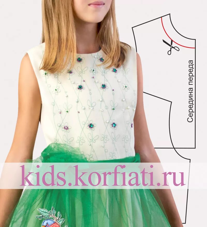 Совсем недавно завершился Конкурс швейного мастерства «Краски детства 2021», и специально для освещения этого события было создано платье из шерстяной ткани тончайшей выделки нежного молочного цвета. Отрезной лиф платья декорирован вышивкой шелковыми нитками и дополнительно расшит бисером, жемчугом и стразами. Воздушности и насыщенности изделию добавила верхняя юбка из фатина зеленого цвета и пояс, перекрученный жгутом, и завязанный на талии в виде объемного цветка. Нашим подписчикам очень понравилось это платье, и в адрес оргкомитета пришло немало писем с просьбами опубликовать выкройку данной модели. В этом уроке мы с удовольствием делимся с вами выкройкой платья с отрезным лифом для девочки, чтобы и вы смогли сшить его самостоятельно.