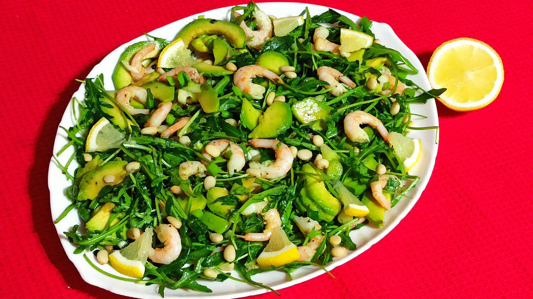 Ингредиенты: Креветки, Авокадо, Руккола, Зеленый лук, Лимон, Оливковое масло, Соль, перец , Кедровые орехи – для украшения, Любви❤️ Способ приготовления: Креветки отварить и очистить. Авокадо очистить и нарезать слайсами, зеленый лук измельчить. В салатнике соединить все ингредиенты, добавить соль/перец по вкусу затем немного лимонного сока и оливковое масло, перемешать. Готовый салат выложить на блюдо, украсить кедровыми орехами и лимоном. Приятного аппетита! Видео рецепт