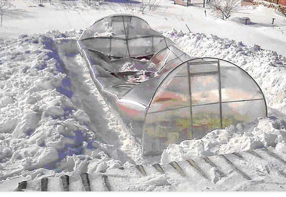 Даже если в вашем регионе малоснежные зимы, все равно нужно выполнить подобную процедуру. Для поликарбонатной теплицы существуют нормы максимальной нагрузки на каркас. В среднем 70см сухого, легкого снега и не более 30см мокрого, слежавшегося. Если выпадет достаточно снега, каркас прогнется, а теплица может полностью разрушиться.
