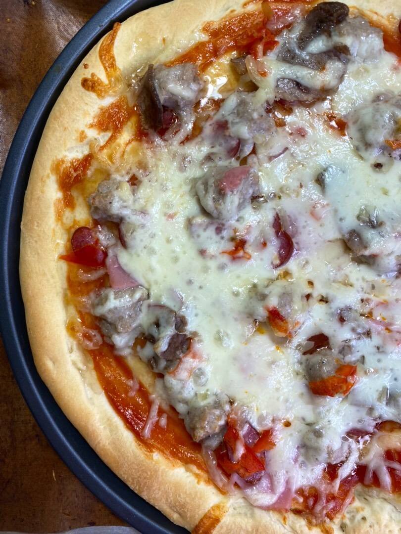 Ингредиенты: Тесто:, Мука, Соль, Молоко, Масло сливочное (размягченное), Дрожжи (быстродействующие), Сахар, Яйцо, Начинка, Томатный соус, Фарш смешанный со специями по вкусу, Охотничьи колбаски, Ветчина, Болгарский перец, Свинина, Сыр Способ приготовления: Молоко подогреть так, чтобы оно было чуть теплее человеческого тела, но не горячее. Добавить к нему сахар и дрожжи. Перемешать и дать постоять минут 10. В миску с мукой добавить яйцо и соль. Перемешать. Влить дрожжевую смесь и размягченное сливочное масло (именно размягченное, выньте его из холодильника заранее). Замешайте тесто. Оно должно впитать всю муку, не липнуть к рукам. Даем постоять около 2,5- 3 часов. При этом через 1 час опускаем его рукой. Место, где подходит тесто должно быть теплое и без сквозняков. Я кладу его в выключенную духовку. Когда тесто подошло, то формируем из него основу для пиццы, делайте как можно тоньше потому, что оно еще поднимется. Выложить основу на смазанный растительным маслом противень. Основу накол
