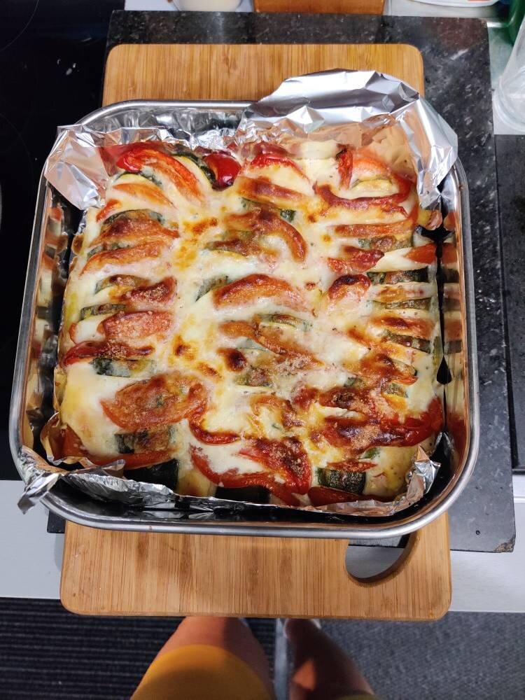 Овощи в разной последовательности всегда рататуй, этот вариант совсем другой, превращается в запеканку #наскоруюруку #французкаякухня Ингредиенты: кабачка цукини, помидора, болгарских перца, чеснока, Черный Перец молотый, Сметана , яйца, Молоко , муки, Базилик, Cыр пармеджиано Способ приготовления: Помыть и нарезать овощи, уложить в форму застеленную фольгой рядами. Взбить яйца со сметаной, молоком, поперчить, посыпать базиликом, залить на овощи. Посыпать сыром пармеджиано, отправить в разогретую духовку на 40 мин.t-200. Приятного аппетита ! Если не подрумянился верх, добавить температуру и 10 минут.