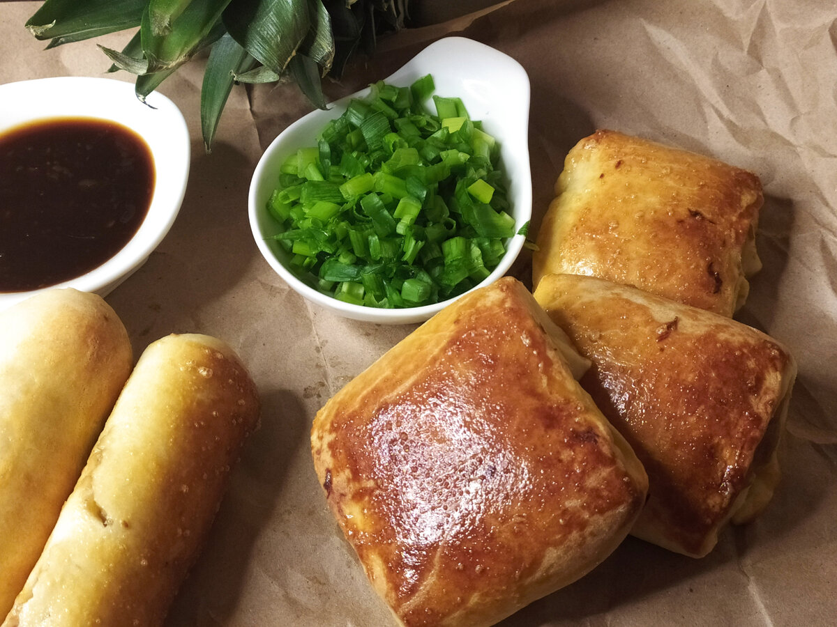 Роллы со свининой, ананасом, имбирем и зеленым луком. Подадим с домашним соусом терияки. 8 штук Тесто: