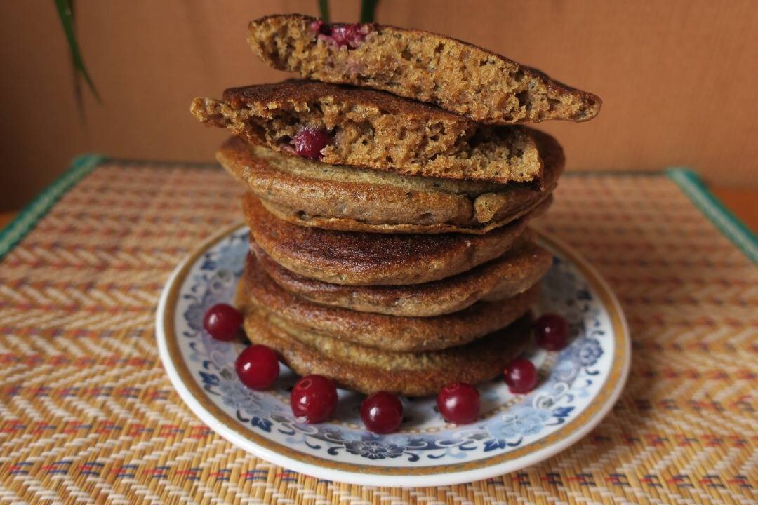 Ингредиенты: Закваска (остатки любые) , Сахар , Сода , Мука пшеничная ц/з , Вода , Мак , Клетчатка яблочная (сухая) , Ягоды Способ приготовления: Смешиваем закваску с водой, добавляем сахар и соду. Начнется реакция кислой закваски с содой, тесто станет подниматься и пузыриться. Кислота закваски нейтрализуется, оладьи будут на вкус не кислыми, а скорее нейтральными, со вкусом муки, ягод и фруктов. Добавляем муку (у меня цельнозерновая, но можно и обычную), мак и клетчатку (это по желанию), перемешиваем. Мукой регулируем нужную консистенцию (кладем чуть больше или чуть меньше). В конце кладем ягоды или кусочки фруктов. Тесто готово. Выпекаем на горячей смазанной маслом сковороде с двух сторон до подрумянивания. Оладьи с тоненькой хрустящей корочкой готовы. Приятного аппетита и успехов в кулинарии!!!