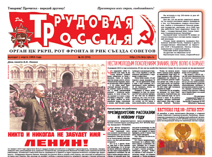 Первый в 2022 году номер «Трудовой России» открывает материал, посвящённый Дню памяти вождя российского и мирового пролетариата, вождя социалистической революции в России «Никто и никогда не забудет имя – Ленин». Никогда не утихнет боль этой утраты, как никогда не исчезнет стремление лучшей части народа овладеть ленинизмом – этим марксизмом эпохи революций и движения человечества к его будущему – социализму.