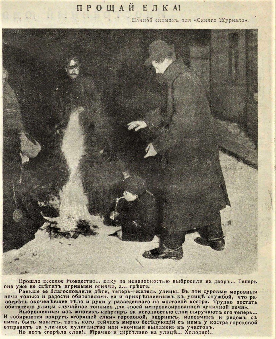 Из январского номера “Синего журнала” за 1912г.: “Прошло весёлое Рождество… Елку за ненадобностью выбросили на двор...Теперь она уже не светит игривыми огнями, а… греет. Раньше ее благословляли дети, теперь—жители улицы. В эти суровые морозные ночи только и радости обитателям её и прикрепленным к улице службой, что разогреть окоченевшее тело и руки у разведенного на мостовой костра. Трудно достать обитателю улицы случайное топливо для своей импровизированной «уличной печи». Выброшенная из многих квартир за негодностью елки выручают его теперь... И собираются вокруг «горящей елки» городовой, дворник, извозчик и рядом с ними, быть может, тот, кого сейчас мирно беседующий с ним у костра городовой отправит за уличное хулиганство или «ночные вылазки» в участок. Но вот сгорела елка!.. Мрачно и сиротливо на улице...Хслодно!..” #дореволюционная россия #старые журналы #старые газеты #начало 20 века #российская империя