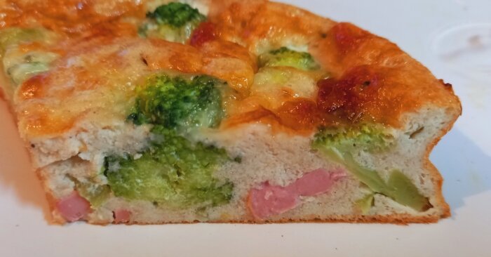 Один из способов как-то использовать остатки еды в холодильнике - запечь их в пироге (или в пирожке, когда остатков мало). Конечно остатки должны подходить друг другу. Мои подходят. Это 4 "кочанчика" брокколи (уже отваренные для другого блюда и долго уже не протянут в холодильнике), сосиска и стебель сельдерея. Вот что с ними делать по отдельности? А вместе очень даже можно чего Сосиску и стебель сельдерея меленько нарезать. Соцветия брокколи разрезать на половинки Замешиваем тесто из двух яиц, трех ложек сметаны, соли, перца (все взбить венчиком) двух ложек муки и ложки разрыхлителя (все размешать венчиком) В тесто вмешать сосиску и сельдерей Вылить в подходящую форму и пристроить сверху половинки соцветий брокколи Сверху посыпать сыром И запекать в духовке, разогретой до 180 градусов минут 40. В общем до золотистого цвета Красота вот какая получается. Маленько смялась верхушка от того, что пирог переворачивали на тарелку. Очень мягкий и нежный получился И вкусный и красивый. И холодн