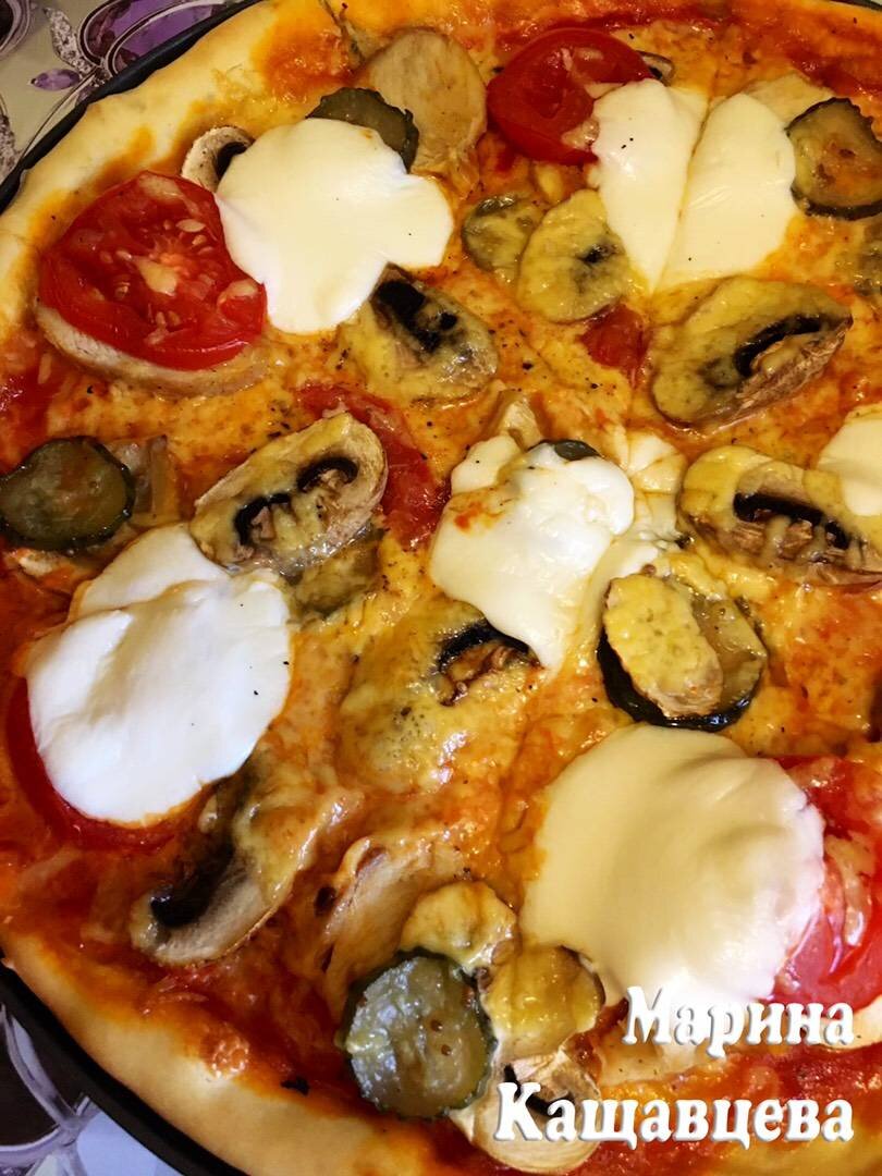 Вкуснейшая пицца «Ассорти» Ингредиенты: муки, воды, сахара, соли, дрожжей, растительного масла, Начинка:, шампиньона, филе куриной грудки, помидор, твёрдого сыра, моцареллы, небольшой соленый огурец Способ приготовления: Половину просеянной муки смешиваем с сахаром, солью, дрожжами и растительным маслом. Добавляем тёплую воду и перемешиваем. Всыпаем оставшуюся муку и замешиваем тесто. Оставляем в теплом месте на 30-40 минут. Затем тесто тонко раскатываем и формируем пиццу. Начинку готовим по вкусу. Смазываем томатным соусом, сверху тёртый сыр, нарезанная копчёная куриная грудинка и надрезанные пластинами грибы. Затем выкладываем кружочками соленые огурчики, помидоры. Сверху ещё немного по желанию посыпаем тёртым сыром. Отправляем в разогретую духовку на 15 минут при температуре 200 градусов. За пару-тройку минут достаём пиццу и выкладываем на неё моцареллу, нарезанную колечками или кубиками. Отправляем в духовку. Я делала две с разным вариантом нарезки моцареллы: крупнее и мельче. Гото