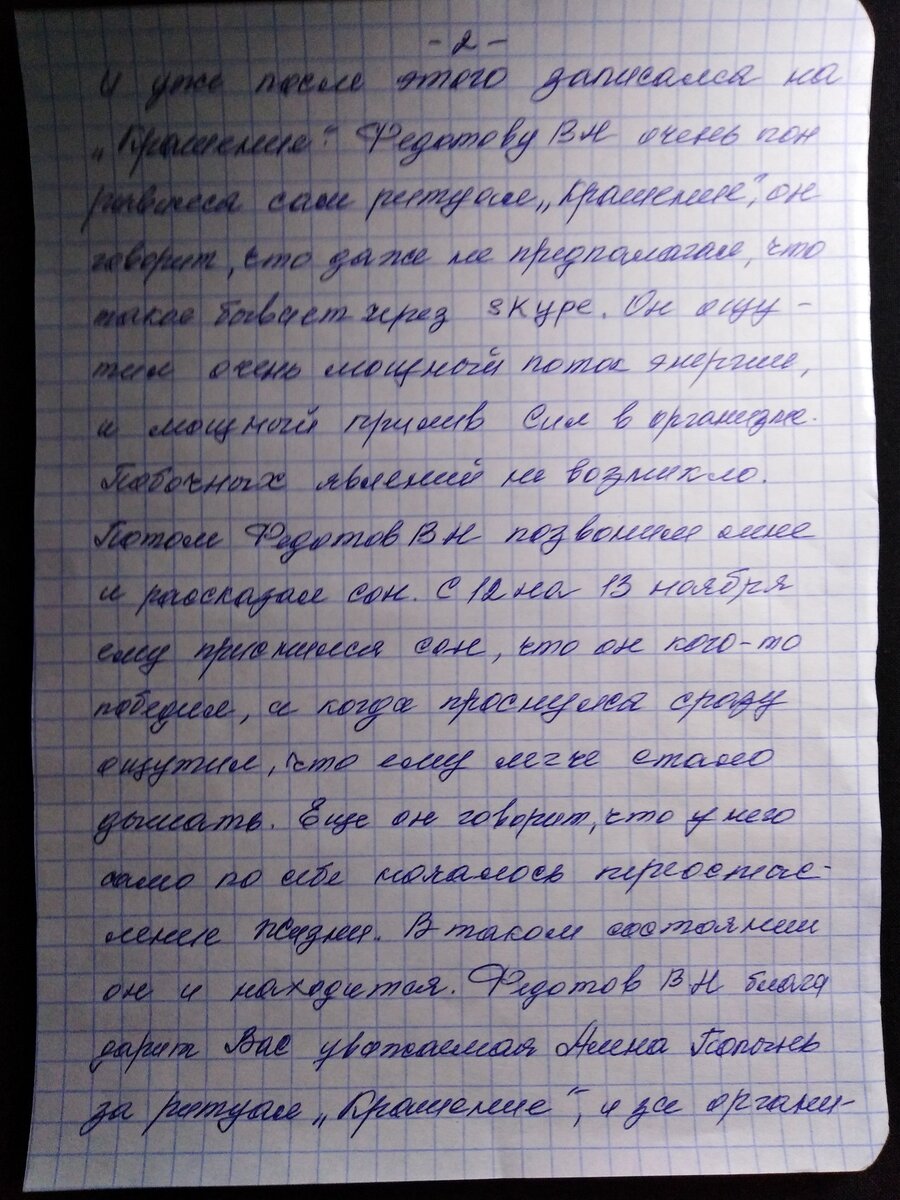 И уже после этого записался на «Крашение». Федотову В.Н. очень понравился сам ритуал «Крашение», он говорит, что даже не предполагал, что такое бывает через Skype. Он ощутил очень мощный поток энергии и мощный прилив Сил в организме. Побочных явлений не возникло. Потом Федотов В.Н. позвонил мне и рассказал сон. С 12 на 13 ноября ему приснился сон, чт