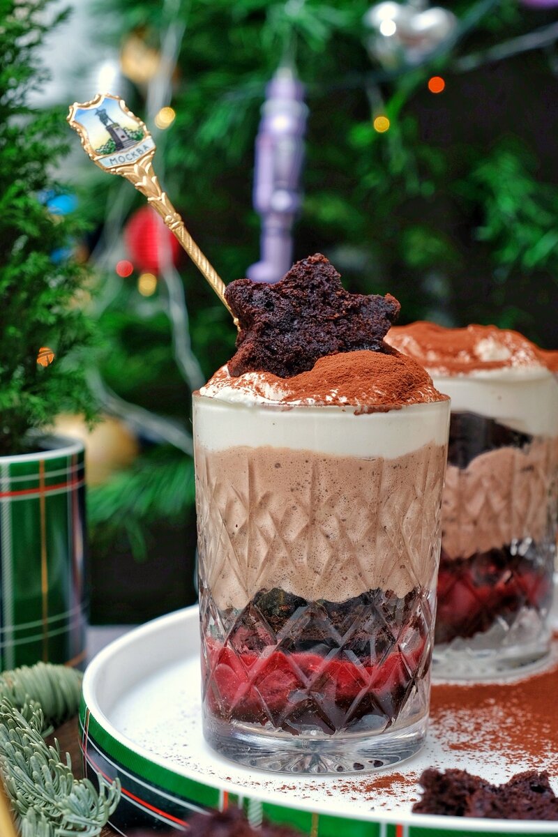 Случилось остаться после новогодних праздников на дне бутылки красного вина... Делить на компанию бокал смысла нет, а вот пустить в приготовление ароматного торта - самое оно... В этот раз я решила готовый бисквит использовать для порционных тортов в стаканчиках. Готовила торт на Рождество, поэтому фотографии ещё на фоне ёлки. Для приготовления торта использовала крем из взбитых сливок, шоколадное мороженое с шоколадной крошкой и ягодный соус. Ингредиенты. Для шоколадно-винного коржа: - 2 больших яйца, - 1 Чашка (200 мл) растительного масла, - 3/4 чашки сахара, - 2 чашки муки, - 2 ч.л. разрыхлителя, - 1 ч.л. соли, - 3/4 чашки какао-порошка, - - 1 чашка кефира (или молоко+сметана 50/50), - 1 чашка красного вина. Для крема: - сливки для взбивания 33-35 % жирности - 500 мл - сахарная пудра - 160 гр. Для соуса: - 200 гр красных ягод (малина, клубника, смородина, можно замороженные) - сахар - 2-3 ст.л. Шоколадное мороженое с шоколадной крошкой - 400 гр. 10 стаканов для подачи,