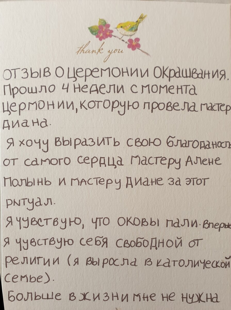 Прошло 4 недели с момента церемонии, которую провела мастер Диана. Я хочу выразить свою благодарность от самого сердца мастеру Алене Полынь и мастеру Диане за этот ритуал.