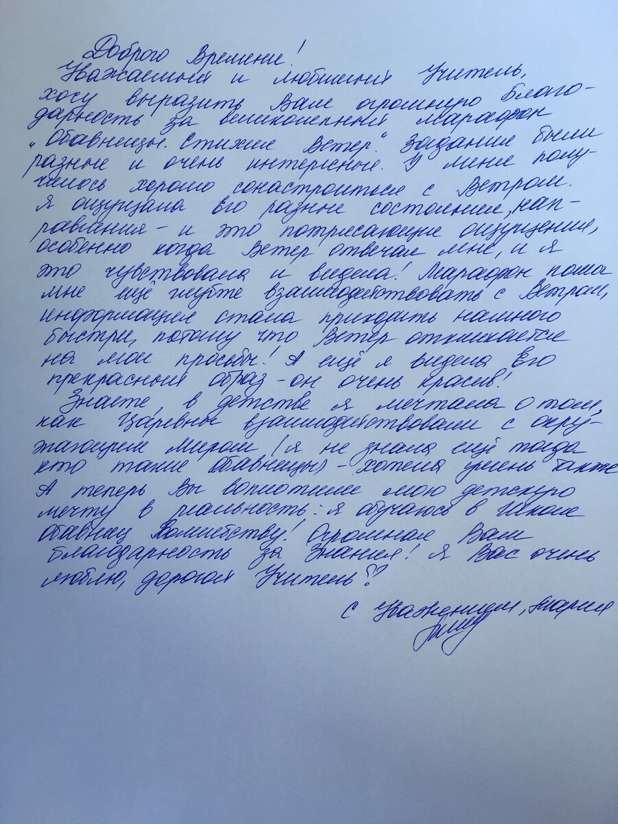 Доброго Времени! Уважаемый и любимый Учитель, хочу выразить Вам огромную благодарность за великолепный марафон «Обавницы. Стихия Ветер». Задания были разные и очень интересные. У меня получилось хорошо сонастроиться с Ветром.