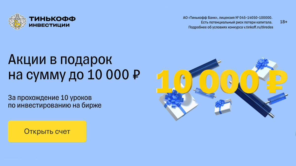 Тинькофф инвестиции - дарит акции на сумму до 10 000 рублей за обучение