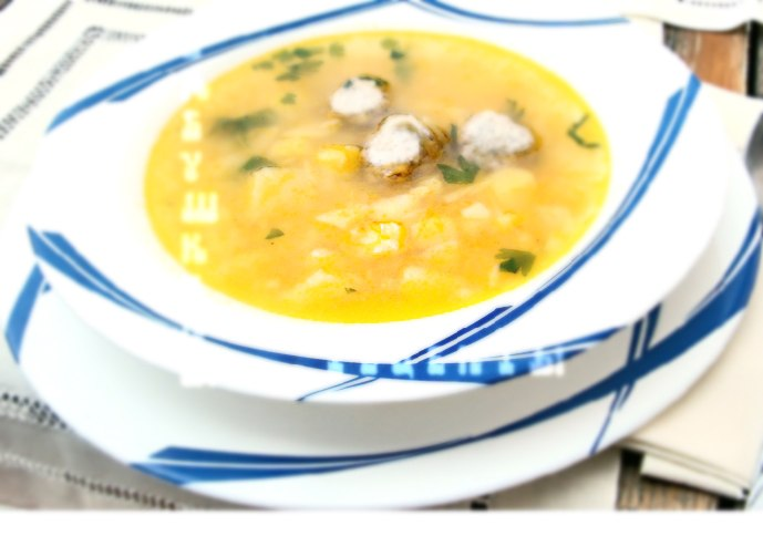 Очистить картофель, нарезать кубиками и поставить варить. В это время морковь потереть на крупной терке, лук порезать кубиками и поджарить с морковкой на сливочном масле. Сформировать фрикадельки, спустить варить, добавить поджарок, посолить по вкусу. При подаче посыпать зеленью. Можно подать со сметаной.