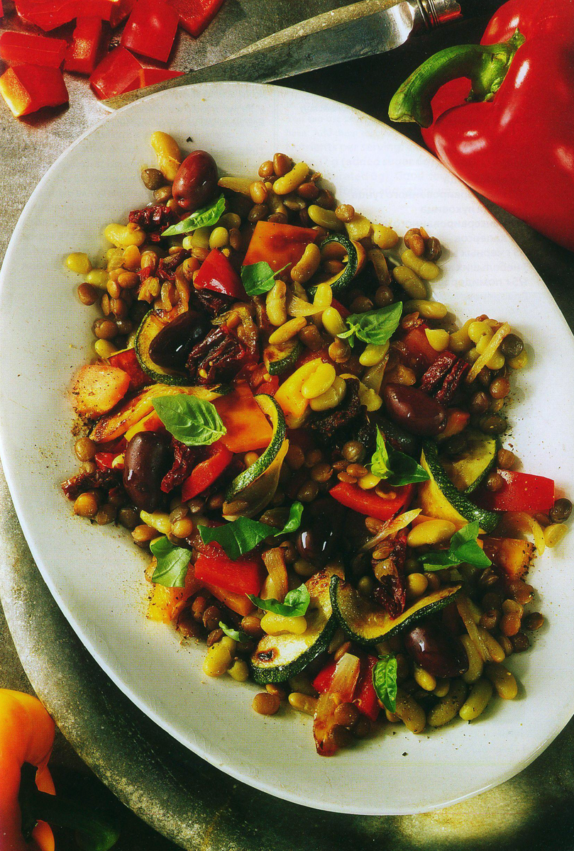 Ароматизированный уксус подчеркивает вкус этого горячего пикантного салата, идеально подходящего для легкого второго завтрака. Время: 20 минут Выход: 4 порции Ингредиенты: 1 красный перец 1 желтый перец 1 средняя луковица 2 средних кабачка 2 ст. л. оливкового масла 420 г консервированной фасоли флажоле 420 г консервированной чечевицы 2 крупные веточки базилика 2 средних помидора 2 ст. л. сушеных помидоров в масле 1 ст. л. бальзамического уксуса Соль и черный перец Для украшения: 12 крупных маслин Шаг 1 Перец промойте, очистите от семян и крупно нарежьте. Лук очистите и нарежьте кольцами. Кабачки очистите, промойте, обсушите и нарежьте тонкими ломтиками. Шаг 2 В большой сковороде разогрейте оливковое масло и обжарьте перец, лук и кабачки на сильном огне, изредка перемащивая. Шаг 3 Слейте жидкость из банок и промойте фасоль и чечевицу. Листья базилика измельчите руками, свежие помидоры промойте, обсушите и крупно нарежьте. Шаг 4 В сковороду выложите фасоль и чечевицу, осторожно перемеш